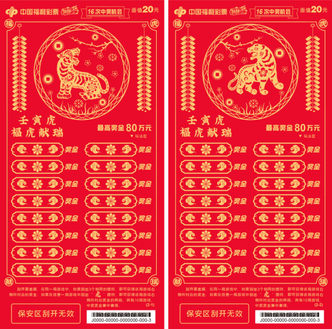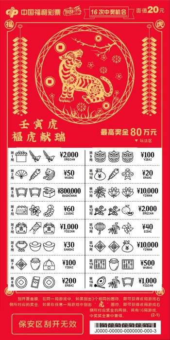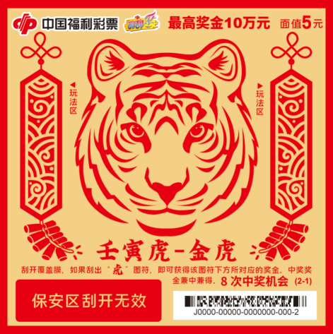 “壬寅虎20元”彩票,在延续往年生肖剪纸设计风格基础上进行了创新,将传统老虎剪纸形象与新中式设计风格巧妙融合,色调采用红金两色,渲染烘托节日喜庆气氛。该款彩票最高奖金80万元,刮开覆盖膜,在同一局游戏中,如果刮出3个相同的图符,即可获得该局游戏右侧所对应的奖金;如果在任意一局游戏中刮出“