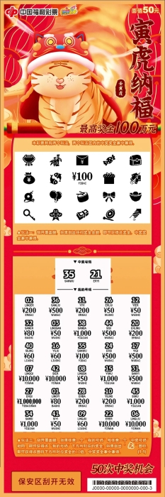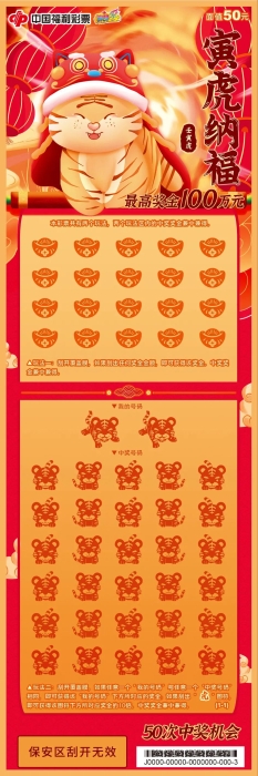 “壬寅虎50元”彩票的老虎形象为“头戴虎帽”的可爱萌虎形象,“壬寅纳福”四个字采用竖向的韵味字体设计,突出春节的节庆感,表达喜庆向上的美好寓意。该款彩票最高奖金100万元,共有两个玩法:一是刮开覆盖膜,如果刮出任何奖金金额,即可获得该奖金。二是刮开覆盖膜,如果任意一个“我的号码”与任意一个“中奖号码”相同,即可获得该“我的号码”下方所对应的奖金;如果刮出“