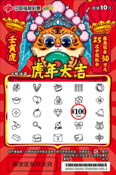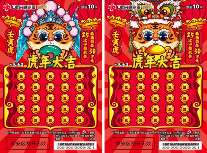 “壬寅虎10元”是一款设计时尚的国潮风生肖票,两款拟人化小老虎各执玉佩和元宝,整体形象分别为我国传统的京剧艺术和舞狮形象,色彩风格大胆奔放,活力十足。该款彩票最高奖金30万元,刮开覆盖膜,如果刮出任何奖金金额,即可获得该奖金;如果刮出“