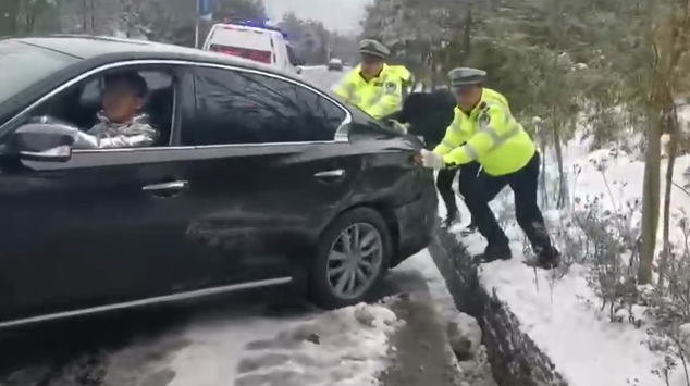 发现情况后,民警立即停车上前询问情况。原来,由于雪天路滑、道路结冰,驾驶员操作不当一不小心车子掉进了路边沟里,他多次发动车辆尝试从沟里驶到路面,但始终未能如愿。得知情况后,执勤民警立即行动,秒变“推车工”,一边指挥驾驶员控制车辆方向,一边合力徒手将车推到路边不妨碍交通的安全地带。