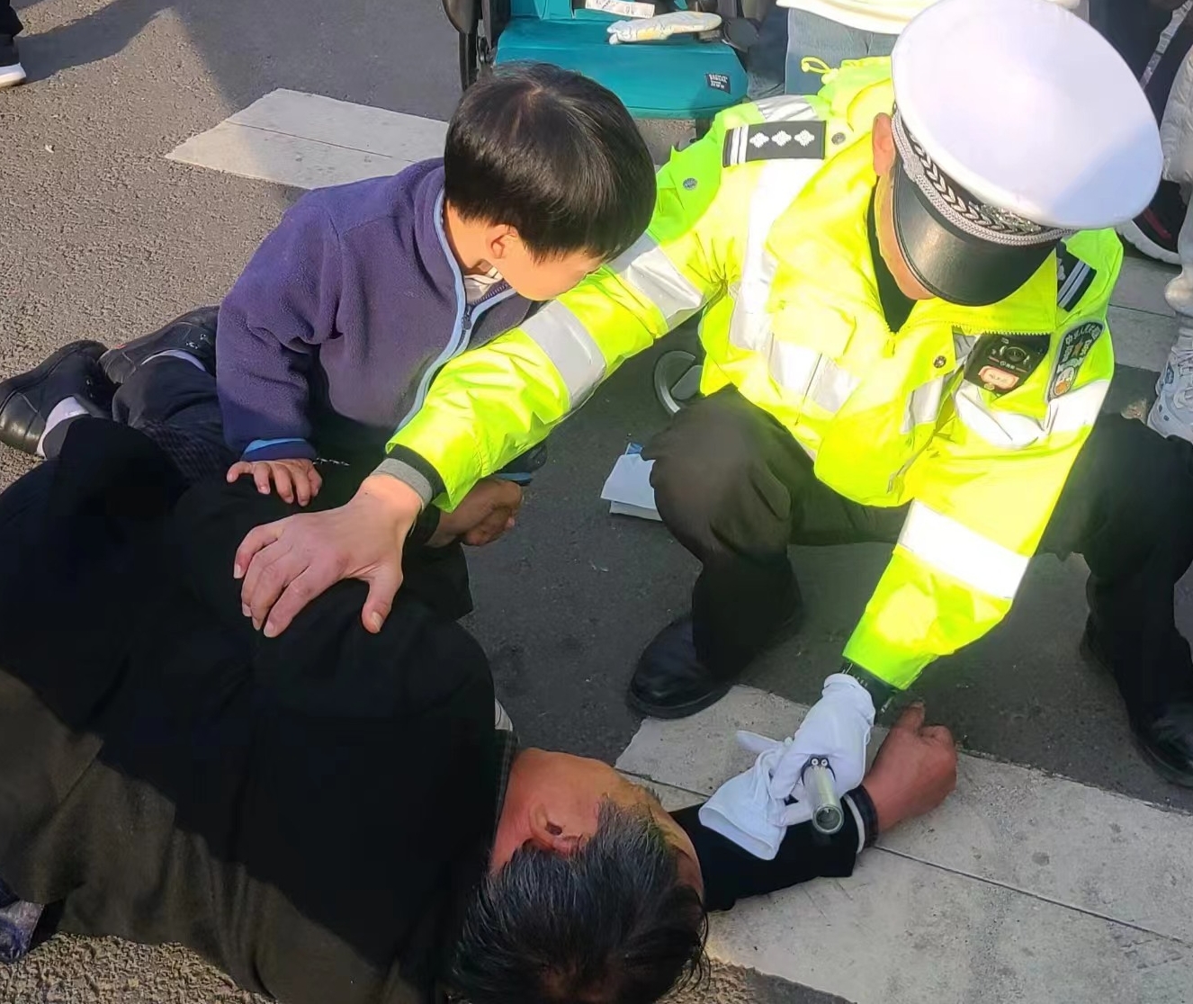 2月16日,大年初七,虽然春节假期已接近尾声,但来天台山国清寺网红景点打卡的游客,仍然非常多。16时25分左右,正在国清景区国清路五峰桥附近执勤的国清交警中队民警姚加助、汪炜力等人忽然听到附近有人喊:“有人晕倒了”。姚加助立即先跑向了围观人群。只见,一名60岁左右的老人晕倒在地上,脸色发白,家人在边上急的束手无措,情况非常危急。民警迅速疏散围观游客,向指挥中心报告,并拨打120急救电话。