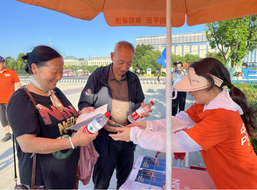 玉环平安财险宣传员在玉环湖绿道广场像市民宣介保险知识