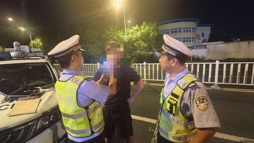 9月5日23时许,天台县公安局交管大队白鹤中队民警在赤城街道金盘大桥附近路段设卡检查时,发现一辆二轮摩托车行驶缓慢,该车将要行驶至检查卡点时,突然准备掉头。