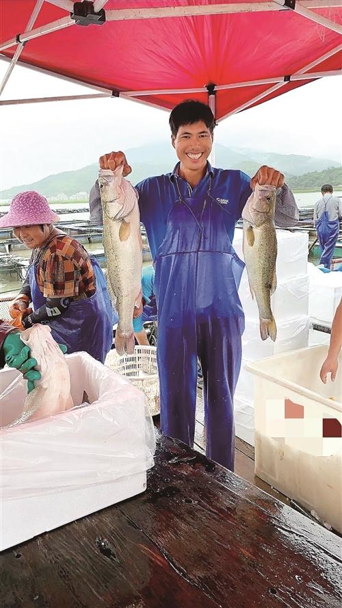 杨济旭在展示可以上市的海鲈鱼。 图片由采访对象提供