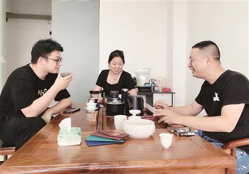 蒋雨舟(右)、李洁(中)在与朋友探讨公司发展思路。