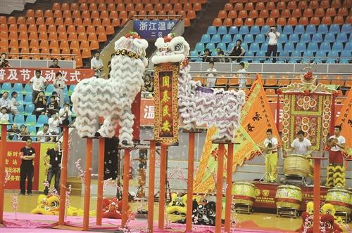 在温岭市全民武术节上,醒狮表演队队员表演醒师武术。