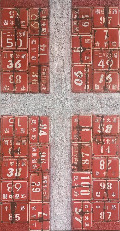 与《徨No.1》不同,《徨No.2》是一件由综合材料制作成的美术作品。《徨No.2》的取材来自废弃的旧门牌,作品里每一块旧门牌,都是张文斌慢慢收集来的,这段收集过程也成了漫长创作的一部分。