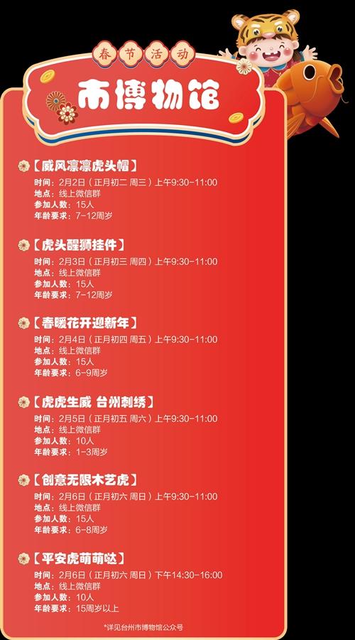 线下展览看过瘾了,线上还有虎年春节主题系列活动等着你“云参与”。从正月初二到初六,台州市博物馆每天都精心准备了新春特辑活动,虎头帽、虎头醒狮挂件、木艺虎……不论剪纸、春联,还是台绣、木艺都是老虎主题,让台州的青少年们在假期里动手又动脑。台州市图书馆也准备了音乐、手工、阅读等不少活动,听图书沙龙,参加云上新年游园会,伴你精彩过大年。