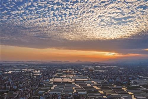 临海市杜桥镇,夕阳西下露出美丽的田园风光。