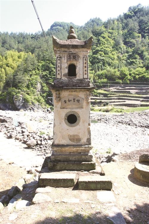 听上辈人多次说起惜纸亭,旧时天台古城的民居内和街巷旁曾建有惜纸亭,只是现已一座也找不到了。真正看到惜纸亭是在天台东乡的灵溪古村,灵溪古村属天台县太平乡三都,现属三合镇,灵溪既是溪名,又是村名,村因溪而得名。当年的龙山书院就在灵溪村村口,现只存书院的门楼,门楣上刻有“龙山书院”四字。书院内供文昌帝君像,文昌帝君主管文运。有书院和文昌阁的村庄,自然会有读书人,读书明理,呈现的是奚氏家族耕读传家的家风。
