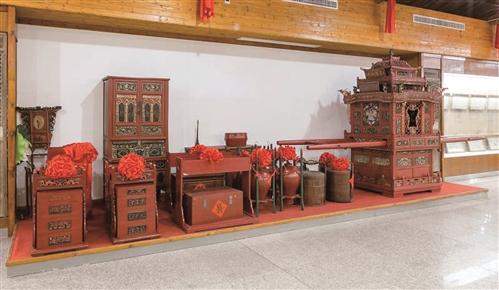 “满堂红妆十里长,花轿浪得十里狂,喜糖撒得十里甜,老酒飘出十里香。”听长辈说,旧时豪富人家嫁妆惊人,床橱、桌凳、器具、箱笼、被铺等日常所需一应俱全。嫁妆多漆成红色,贴上“红双喜”,故称“满堂红”。