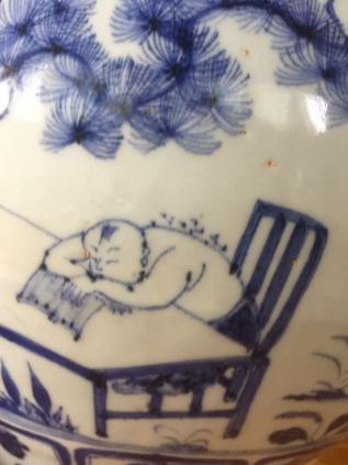 综观这件元青花“恣蚊”图大罐,其时代气息是非常浓郁的。首先,是器宇豪放大度,造型线条流畅。釉面滋润肥厚,凝脂似玉。青花料二元配方,苏麻离青高铁低锰,铁锈斑凹陷下沉,有明显的蜘蛛网格斑,缩釉点。胎体粗松,气孔明显,刮削修胎流畅老到。褐铁矿红斑过渡自然。其次,是绘画繁而不乱,层次鲜明,孝子在松树下忍受无数蚊子的恣意饱血,丝纹不动,其“爱亲之心至矣”,令人心动。