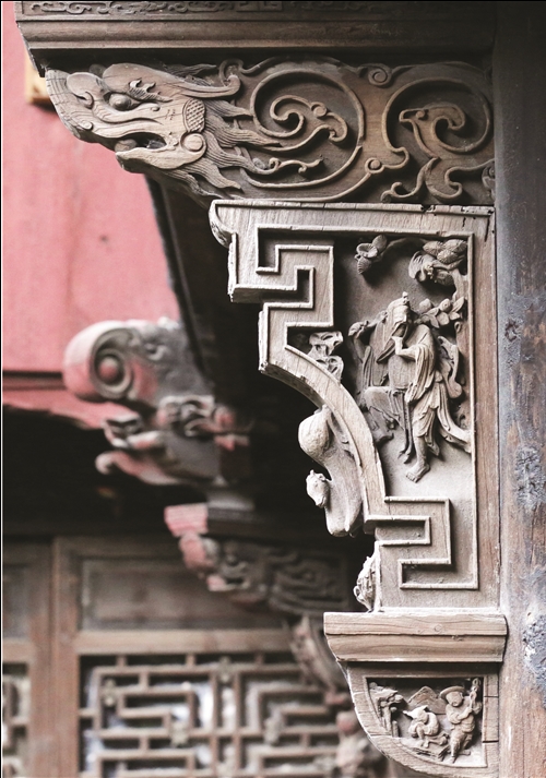 在木雕的构件上,葭沚民宅中经常会用到龙的纹饰,下街黄菊生宅牛腿、月梁,中街长泰巷临街牛腿,龙形图案频繁出现。