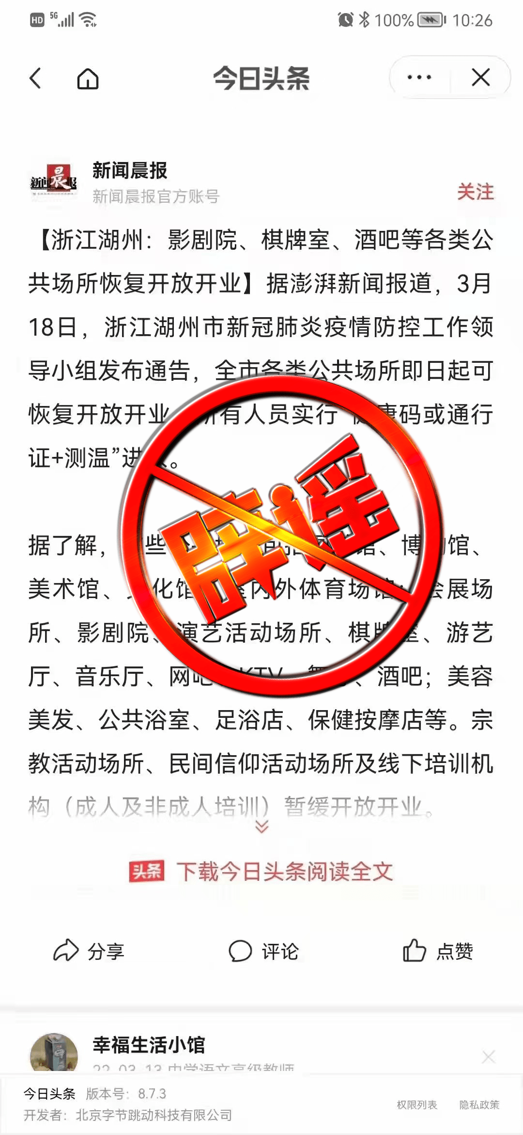 内容为“3月18日,浙江湖州市新冠肺炎疫情防控工作领导小组发布通告,全市各类公共场所即日起可恢复开放开业,所有人员实行‘健康码或通行证+测温’进入”。转载来源为今日头条APP。