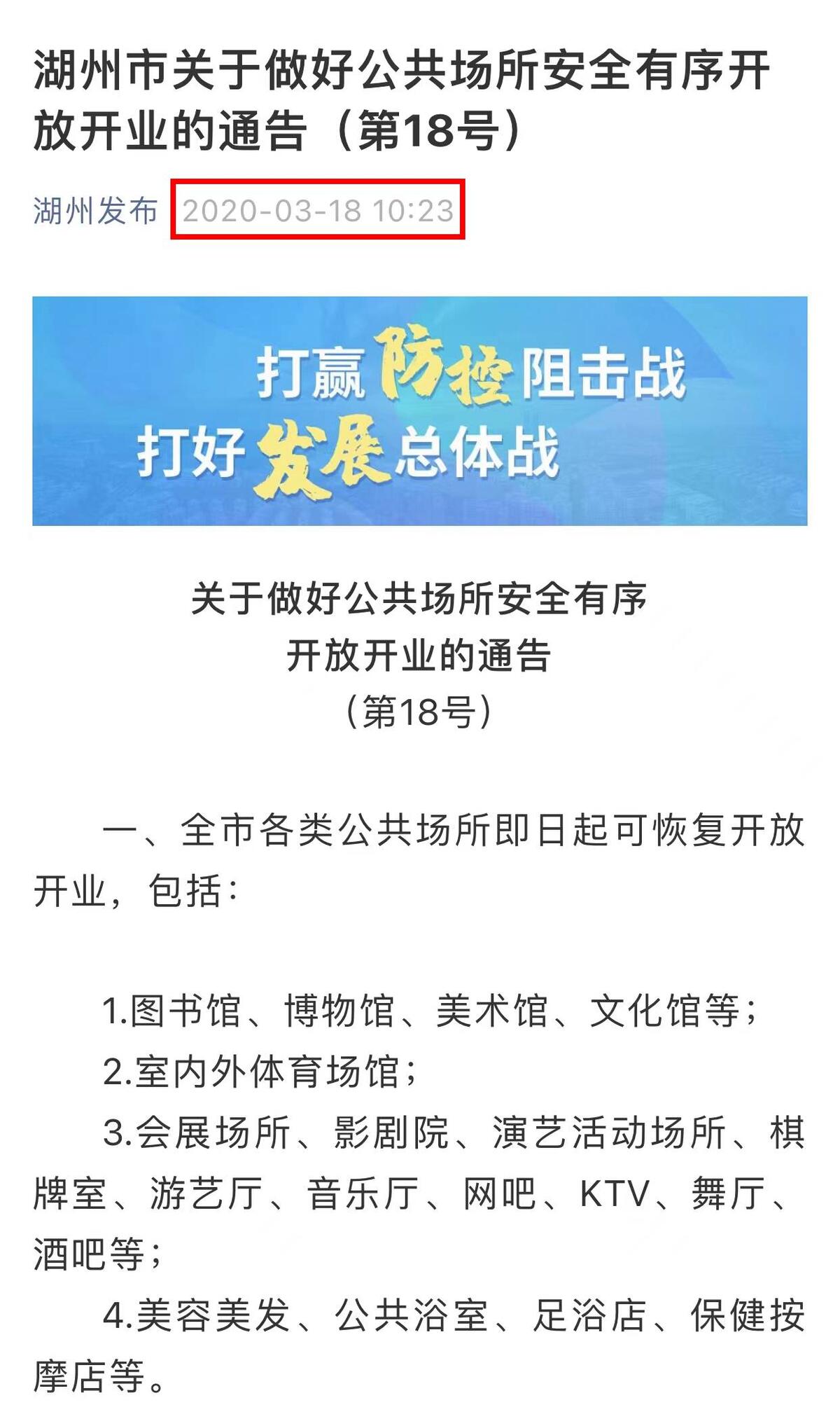该截图原文来自2020年3月18日发布的《湖州市关于做好公共场所安全有序开放开业的通告(第18号)》。