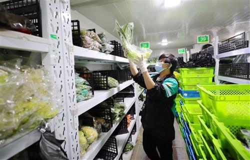 深夜,在位于上海闵行区老沪闵路的一家网络购物平台仓配站点,工作人员在冷藏库内将新到货的蔬菜分类摆放到货架上。