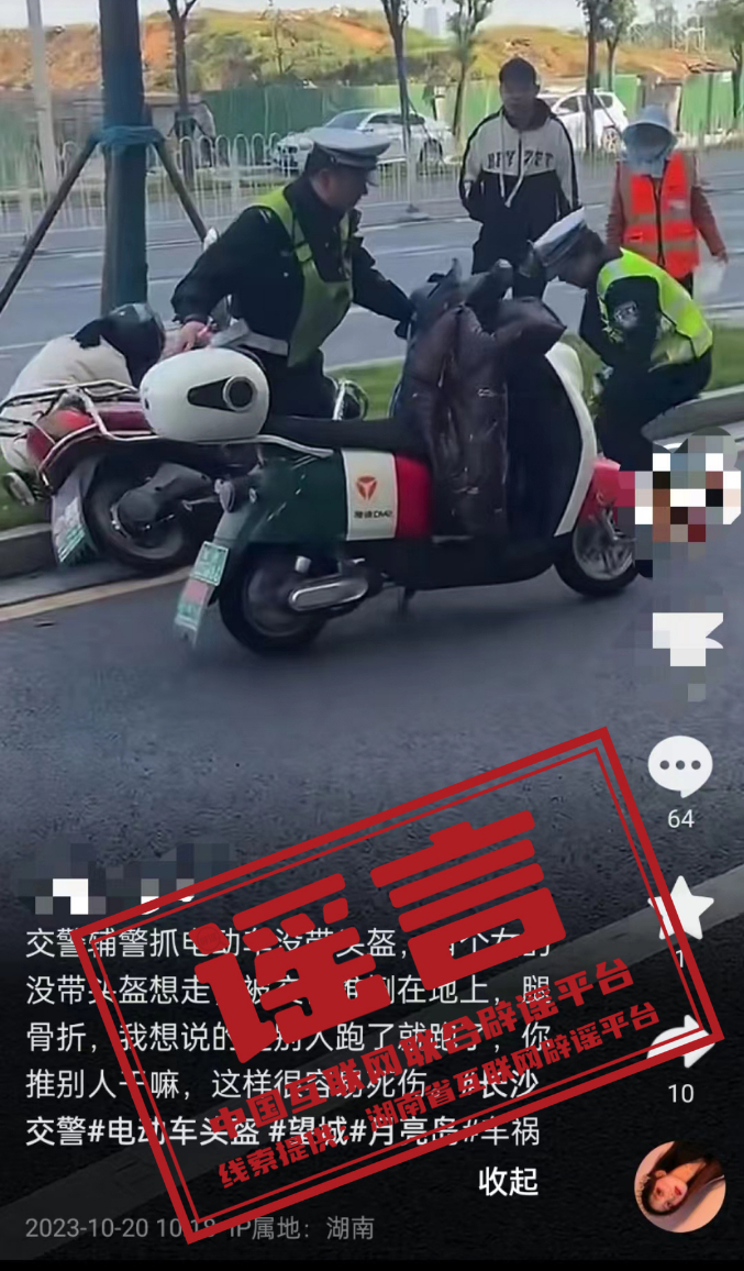 真相:近日,一段“长沙交警执法时推倒电动车”的网络视频引发关注。对此,长沙市公安局望城分局通过调取涉事交警的执法记录仪,还原了事实真相:两台电动车发生刮擦,造成两名车主摔倒,执勤交警发现后上前救助,并随即将伤者送往医院治疗,经诊断已无大碍。然而,网民李某某(男,28岁,岳阳市平江县人)为博取关注,发布虚假短视频,故意将交警扶人的事实造谣成为“交警推人”,恶意炒作,误导网民。李某某因涉嫌虚构事实、散布谣言、扰乱公共秩序,被望城分局依法处以行政拘留5日的处罚。(来源:“中央政法委长安剑”微信公众号、“长沙警事”微信公众号)