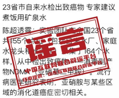 真相:近期,一则“23省44城自来水检出消毒副产品(亚硝基二甲胺)致癌物”的消息在某短视频平台传播。经查证,早在2016年10月,新华社、“网信四川”、上海辟谣平台等针对此消息已进行多次报道辟谣。
