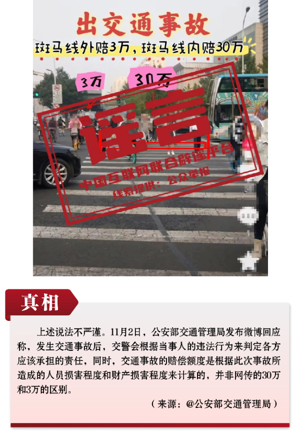 谣言4:行人发生交通事故,斑马线外赔偿3万、斑马线内赔偿30万?