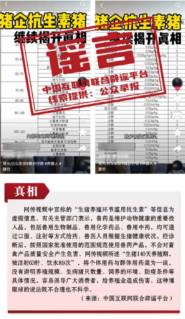 此外,还有部分自媒体或凭空杜撰、或夸大其词,翻炒旧谣、制造焦虑。如“23省44城自来水检出消毒副产品(亚硝基二甲胺)致癌物”系2016年的旧谣翻炒,危言耸听、愚弄公众。“某生猪养殖企业140天饲养周期内用34种抗生素”,这种博眼球的虚假信息既不合理也不科学,不仅误导广大消费者,还给养殖业造成伤害。