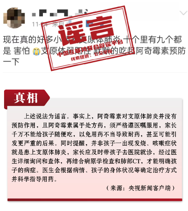 谣言2:可自行给儿童服用阿奇霉素,以预防支原体肺炎?