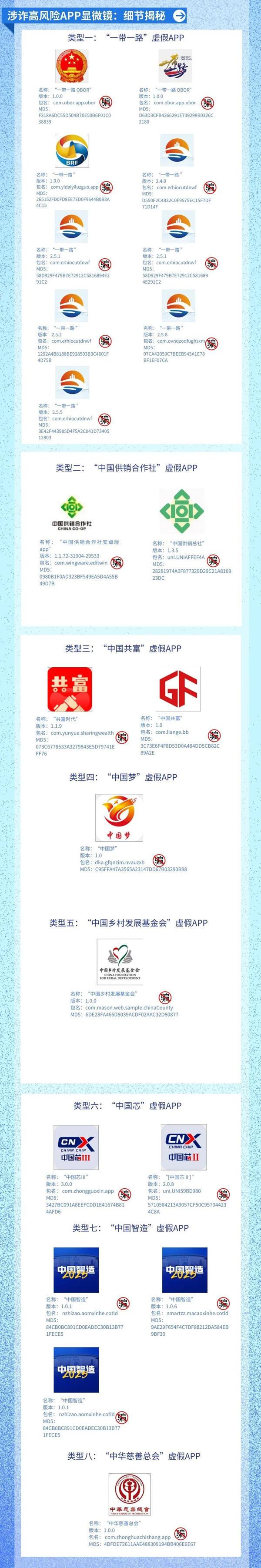 详情:近日,工信部反诈专班公布了一批涉诈高风险APP,一些不法分子套用各类官方公开信息,打着“国家支持项目”“国家惠民政策”旗号,制作出一大批涉诈APP,在其中编造虚假投资理财项目,以高收益为诱饵,忽悠不明真相的群众在APP“投资”,进而实施诈骗。