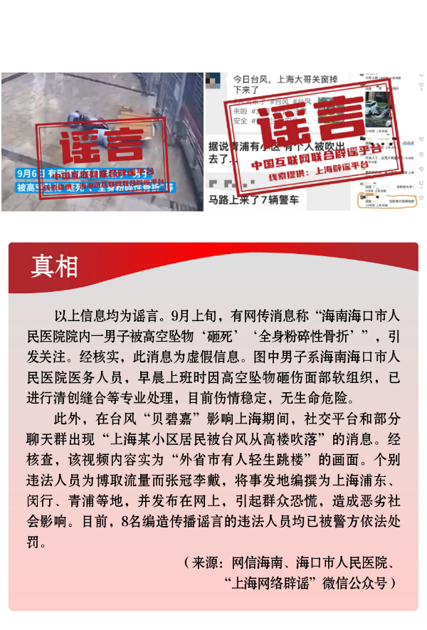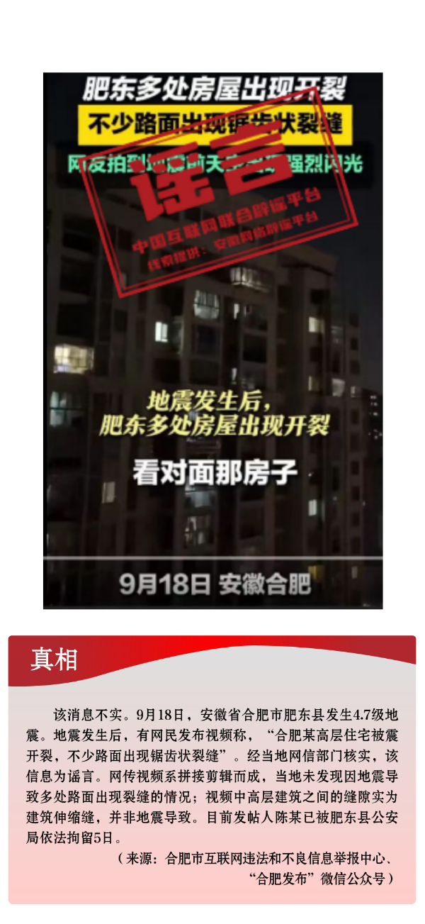 炒作灾害事故制造焦虑。9月,台风“摩羯”“贝碧嘉”接连来袭,全国多地灾情严峻;安徽、新疆等部分地方发生地震,威胁民众生命财产安全。个别自媒体和网民为博取关注、吸引流量,或夸大其词,或张冠李戴,或移花接木,借机编造发布“台风天海南有医务人员被砸死”“上海有人因台风被吹落高坠”“广东某石材城牌坊被台风吹倒”“台风‘摩羯’致广西多地‘一片狼藉’”等不实信息,引发群众恐慌,造成不良社会影响。谣言“合肥肥东地震导致高层住宅出现裂缝”系拼接剪辑视频而成,蓄意歪曲事实;“重庆市沙坪坝区突发7级地震”则纯属子虚乌有。此外,一些网民刻意杜撰并扩散“一冷藏车里发现15名被拐儿童”“重庆江北观音桥抓人贩子”“人贩子到广西贵港市中心抓人”等严重失实的涉公共安全类谣言,蓄意制造焦虑,扰乱社会秩序。