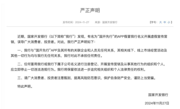 详情:近期,有名为“国开先行”的APP假冒国家开发银行名义开展虚假宣传营销,误导广大消费者、投资者。对此,国家开发银行于11月27日在官网发布《严正声明》: