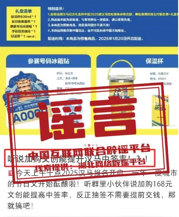 真相:近日,2025年武汉马拉松报名通道正式开启。在社交媒体上,有网民称“加购168元的文创套餐可以提高中签率”,引发关注。对此,武汉马拉松赛事主办方官方工作人员表示,“购买文创套餐不能提高中签率,此类信息纯属小道消息,一切以官方公告为准。”(来源:“湖北网络辟谣”微信公众号、@长江云新闻)