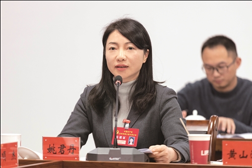 1月2日,市直一代表团姚君丹代表建议完善家校社协同立法机制,加大家庭教育工作财政投入。 台传媒记者李洲洋摄