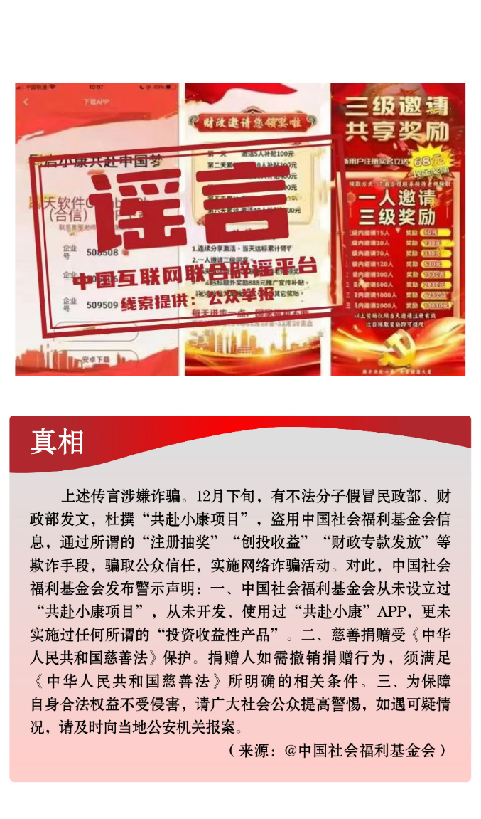 虚构公共政策行骗牟利。12月,一些不法分子假冒官方之名,伪造各类公共政策。如编造“史上最严车检来了”“燃油车年检增加OBD检测”“海南12月1日起对新能源汽车征收养路费”等虚假政策信息,给广大车主造成困扰。另有人假冒民政部、财政部、国家医保局、海南省住建厅等部门和单位,杜撰所谓“共赴小康项目”“电子医保卡”“海南一号特批安居房”等虚假信息,企图骗取公众信任,进而实施诈骗活动。