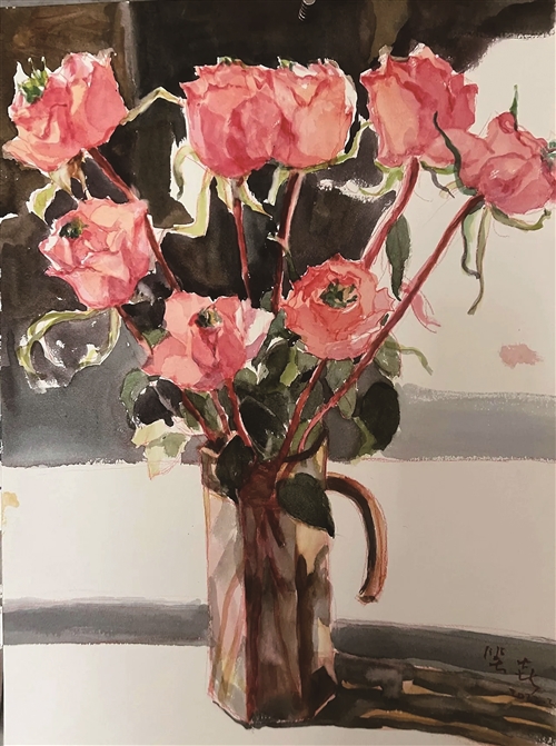 而她的水彩作品,又以另一种风貌面世。如果说她的铜版画是深邃沉稳的古琴声,那么水彩画就是悠扬欢快的小提琴曲。在《花语》系列中,无论是《红色玫瑰》还是《紫色睡莲》,色调都是清新明快的。还有《江海系列》,耗时三年才完成创作,她将海浪作为绘画对象,用浪瞬间凝固的庄严和巍峨、理性和安静,来抒发自己的情感。