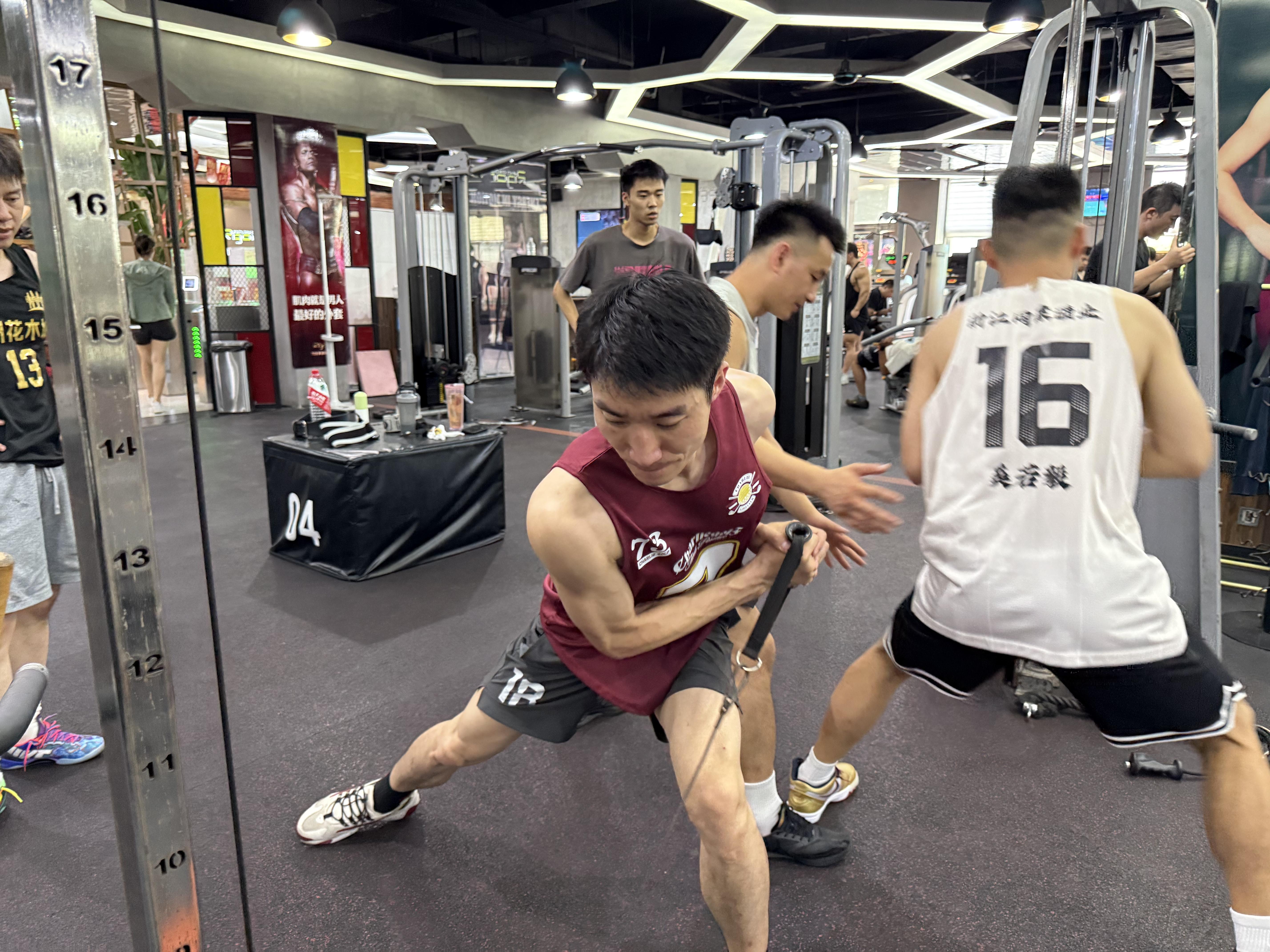 当天练上肢力量。除引体向上外,球员还进行了高抬杠铃练习。“虽然累,但身体素质确实增强了,打球时状态也更好了!”球员李炳镔边擦汗边说。