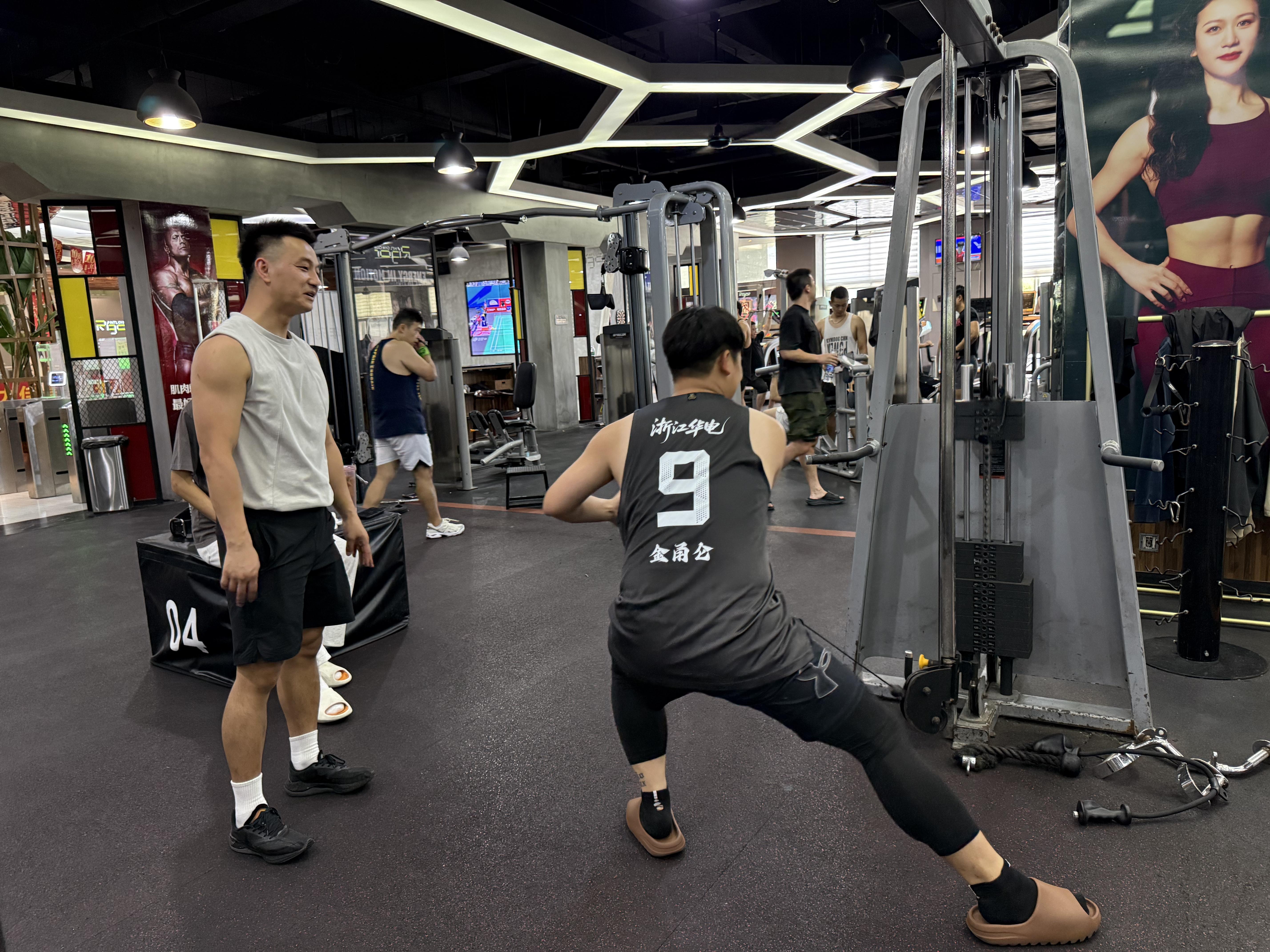 8月5日上午,记者在力佳美国际健身器材区看到,“浙BA”台州湾新区队的球员正围着龙门架,轮流抓握横杆做引体向上,他们手臂肌肉绷紧,身体随发力上下起落。体能教练杨宏站在一旁,指导动作细节。“核心再收紧点,下落别太快。”