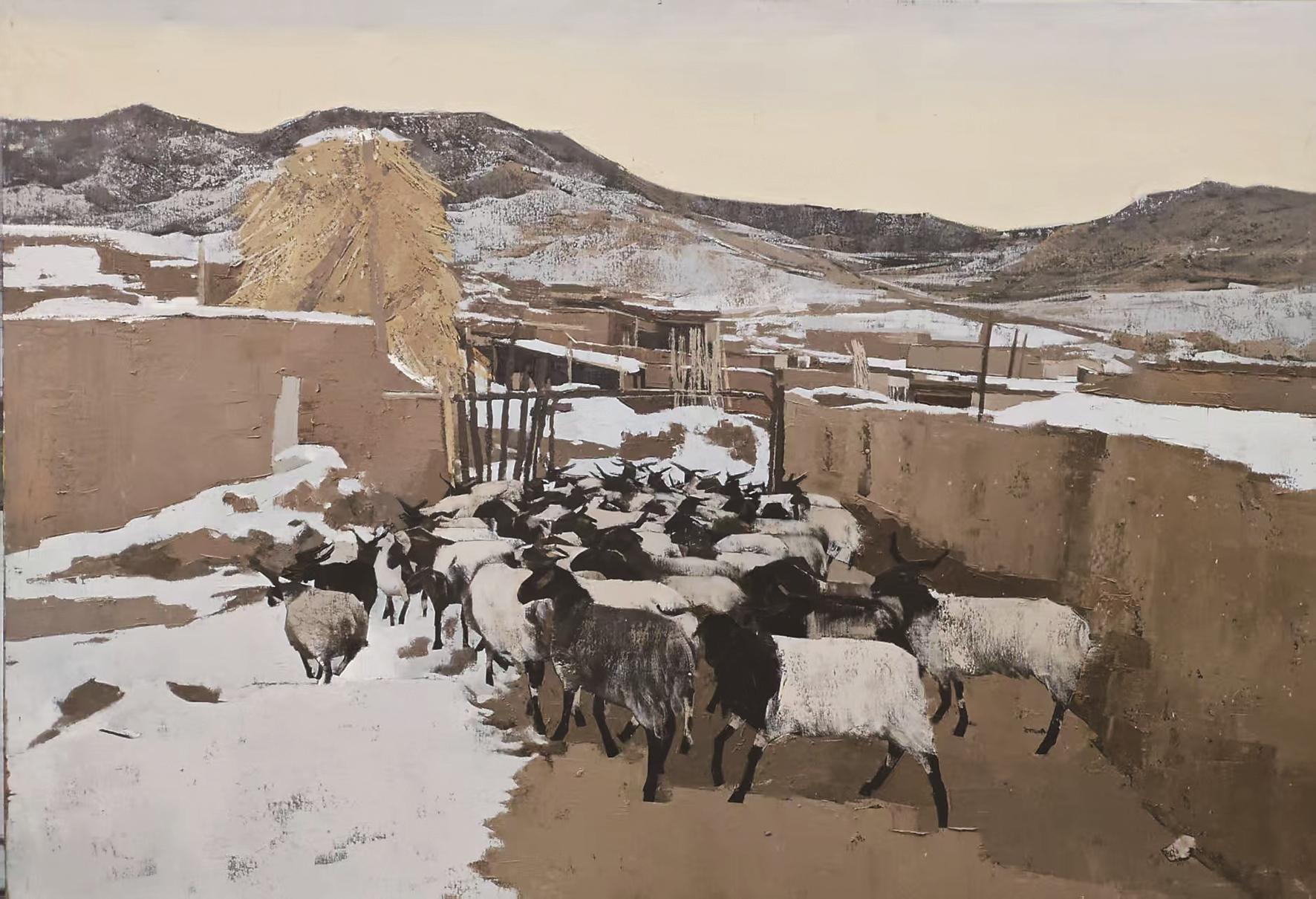 王季娟的《雪塬归牧》以“记录游牧文明的当代形态”为创作核心,描绘了冬季羊群转场的生活场景。作品以土黄、黑白、浅灰为主色调,土坯墙的厚重与积雪的冷白形成鲜明对比,羊群的纹理增强了画面层次。整体色调既还原牧区的苍茫质感,又凸显冬季的清冷氛围。
