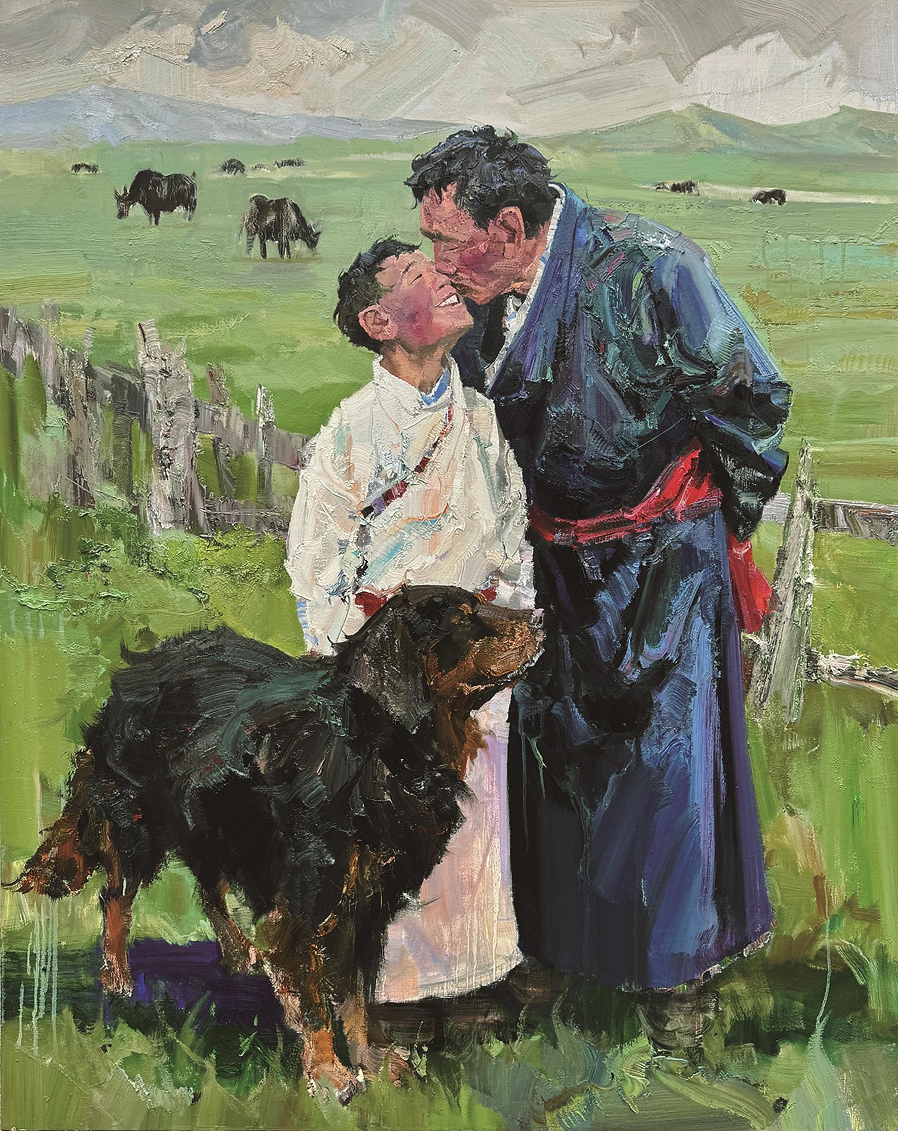 刘佩君的《草原晨曲·父子情》以现实主义的艺术语汇和饱满抒情的笔触,构建出独特的绘画语言。画面中,深蓝藏袍与孩童白衣的色彩对比、藏獒与草地的肌理呼应、亲情与辽阔空间的层次安排交织成诗意的叙事结构。作品展现了画家在形式构建与情感表达上的探索,也凝聚了她对草原生活的深切体悟。